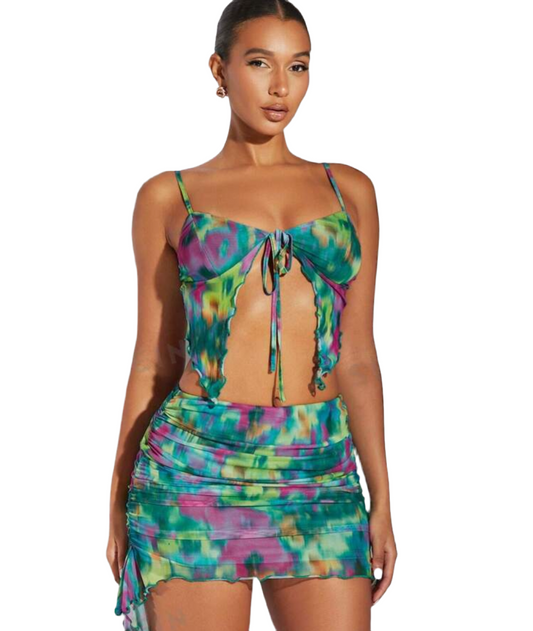 Tie Dye Cami Top & Draped Side Bodycon Skirt (Green)